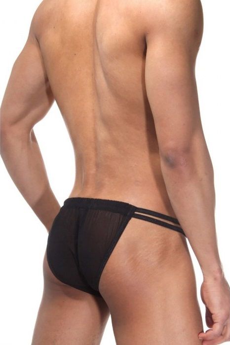 Мужские трусы-танга из полупрозрачной тянущейся ткани. По бокам двойные резинки, трусы с вырезом.