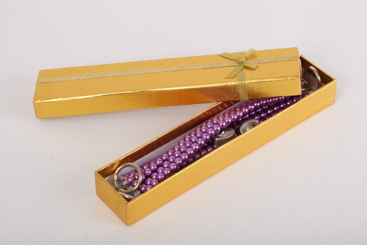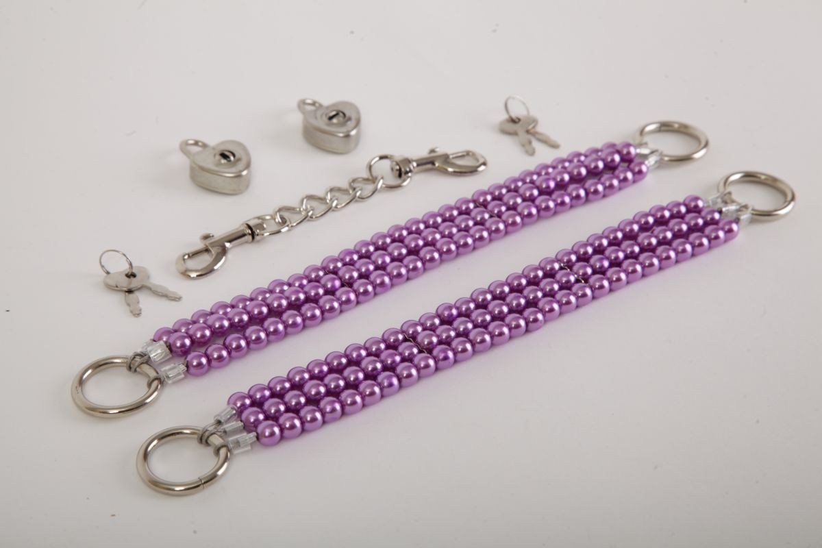 Красивые наножники из фиолетового жемчуга с замочками в виде сердца и четырьмя ключиками. Чтобы ограничивать движения есть небольшая цепочка с двумя карабинами. Упаковка - картонная золотая коробка с бантиком. Длина соединительной цепочки - 13 см. Длина браслетов - 26 см., ширина - 2,5 см.