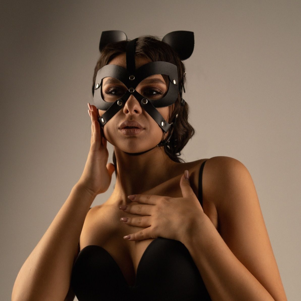 Кожаная маска-шлем с маленькими ушками. Маска имеет прорези для глаз .