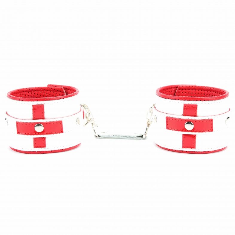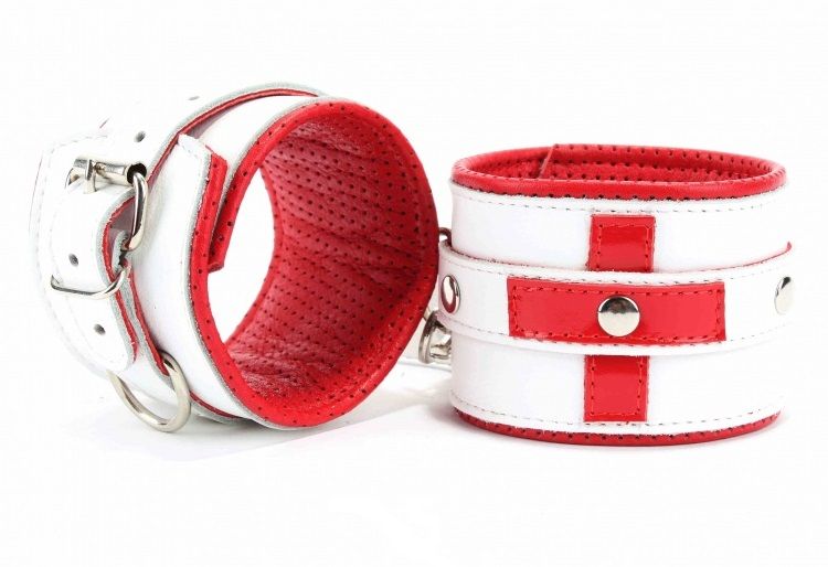 Наручники из натуральной кожи на пряжке, декорированы для образа медсестры. Выполнены из белой гладкой кожи с ярко-красным крестиком, подклад из нежной кожи с перфорацией. Ширина - 6 см.