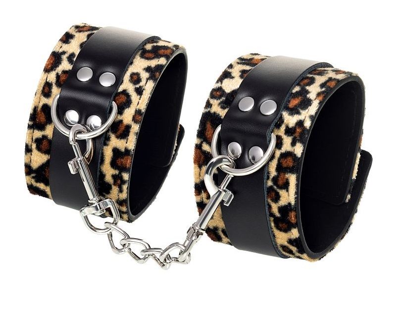 Изготавливаются из кожи с велюровой подкладкой. При изготовлении использована фурнитура с никелевым покрытием. Между слоем основы и подкладкой проложена мягкая прокладка. Соединяются между собой коротким ремешком с двумя карабинами на концах. Не нарушают кровообращение, надёжно фиксируются на щиколотках. Эти яркие оковы с леопардовым принтом сделают подчиненного неотразимым. Леопардовый окрас демонстрирует агрессивный вид. Все звериное нутро, страсть и свобода призывают действовать.