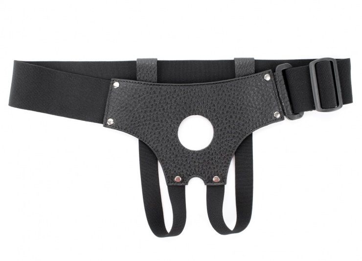 Трусики для страпона, изготовлены из кожи, имеют отверстие-доступ в области бикини. Крепятся при помощи широких эластичных лент. Размер легко меняется при помощи застежки. Диаметр отверстия для страпона - 4 см.
