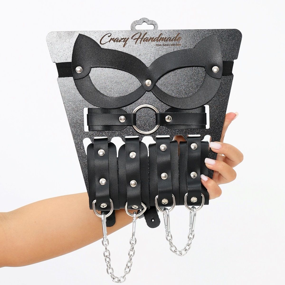 В набор входит маска, чокер-ошейник, наручники и оковы. Маска «кошка» однослойная выполнена из натуральной кожи черного цвета и дополнена металлической фурнитурой высокого качества. Аксессуар плотно прилегает к лицу и хорошо фиксируется на любой обхват головы благодаря упругой широкой резинке. Чокер представляет собой основу из натуральной кожи и ремешок, скрепленные между собой качественной фурнитурой. Классический внешний вид изделия позволяет носить чокер и в качестве аксессуара для дополнения образа, и использовать во время любовных игр. Посередине расположено стальное хромированное кольцо, что позволяет (при желании) использовать чокер вместе с поводком. Наручники представляют собой основу из натуральной кожи и ремешок, скрепленные между собой качественной фурнитурой. В комплект входит соединительная цепочка с двумя карабинами. Оковы представляют собой основу из натуральной кожи и ремешок, скрепленные между собой качественной фурнитурой. В комплект входит соединительная цепочка с двумя карабинами. Длина маски - 19,5 см, ширина - 10 см. Длина чокера - 45 см, ширина - 3 см. Обхват чокера - 34,5-43,5 см. Длина наручников - 22 см. Ширина основы наручников - 4 см. Ширина ремешка наручников - 1,9 см Обхват наручников - 15,5-21 см. Длина оков - 29 см. Ширина основы оков - 4 см. Ширина ремешка оков - 1,9 см Обхват оков - 21-28 см.